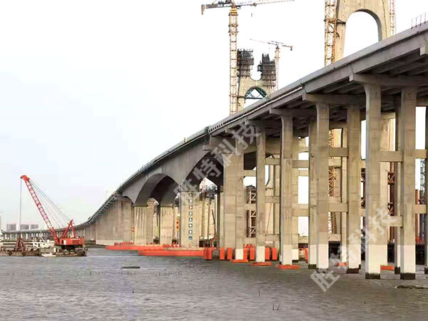 福建泉州安海灣大橋始建于2017年,全長9.46千米,跨海區段橋梁長度1.56千米,主跨300米,預計2021年修建完成。考慮到橋下通船安全,采用勝特科技公司設計并制作的防撞設施進行橋梁安全防范。